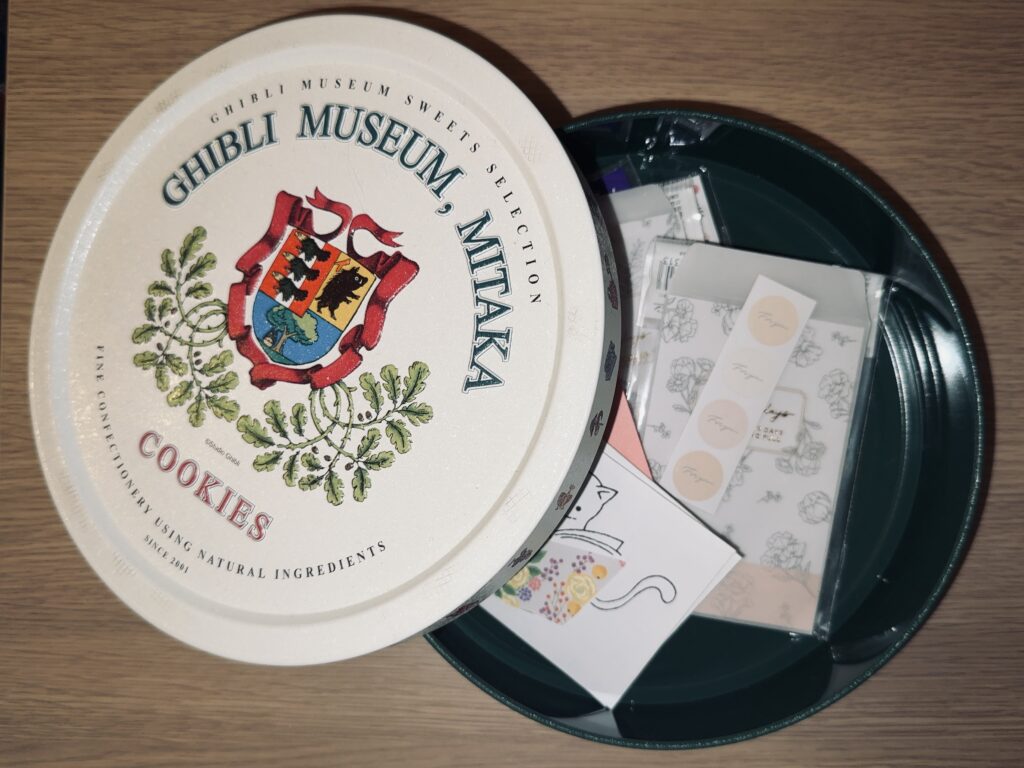私はジブリ美術館に行ったときに買ったクッキー缶に小さい便せんやメッセージカードを入れています。