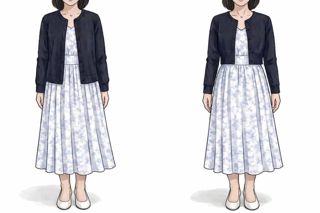 骨格ウェーブの方がカーディガンを着たときに「似合わない」と感じる理由のひとつは、丈のバランスです。